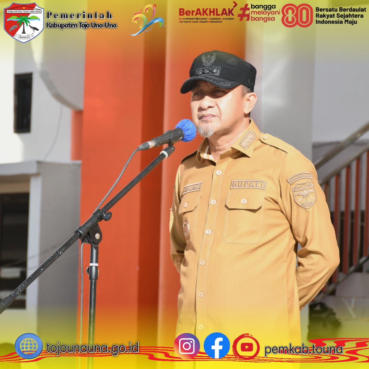 Apel perdana ini dipimpin langsung oleh Bupati Tojo Una-Una, Ilham Lawidu, dan dihadiri oleh Sekretaris Daerah, para Asisten dan Staf Ahli Bupati, pimpinan perangkat daerah, Camat Ampana Kota, Camat Ratolindo, serta seluruh ASN yang terdiri dari PNS, PPPK, dan tenaga honorer di lingkungan Pemerintah Kabupaten Tojo Una-Una.