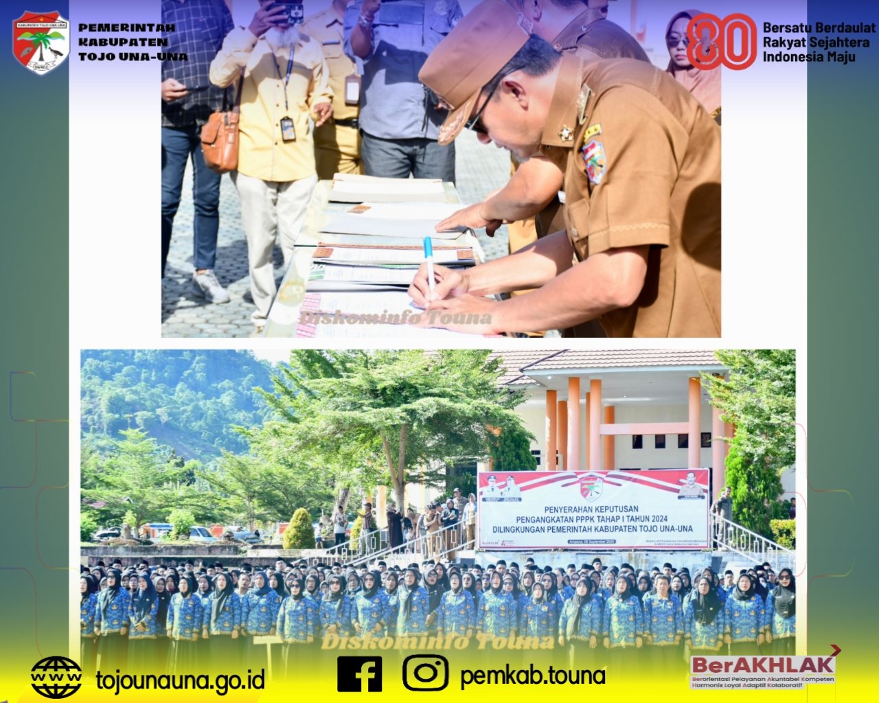 tojounauna.go.id, Ampana – Pemerintah Kabupaten Tojo Una-Una menggelar acara penyerahan Surat Keputusan (SK) Pengangkatan Pegawai Pemerintah dengan Perjanjian Kerja (PPPK) Tahap I Tahun 2024, bertempat di Halaman Kantor Bupati, Senin (08/09/2025).