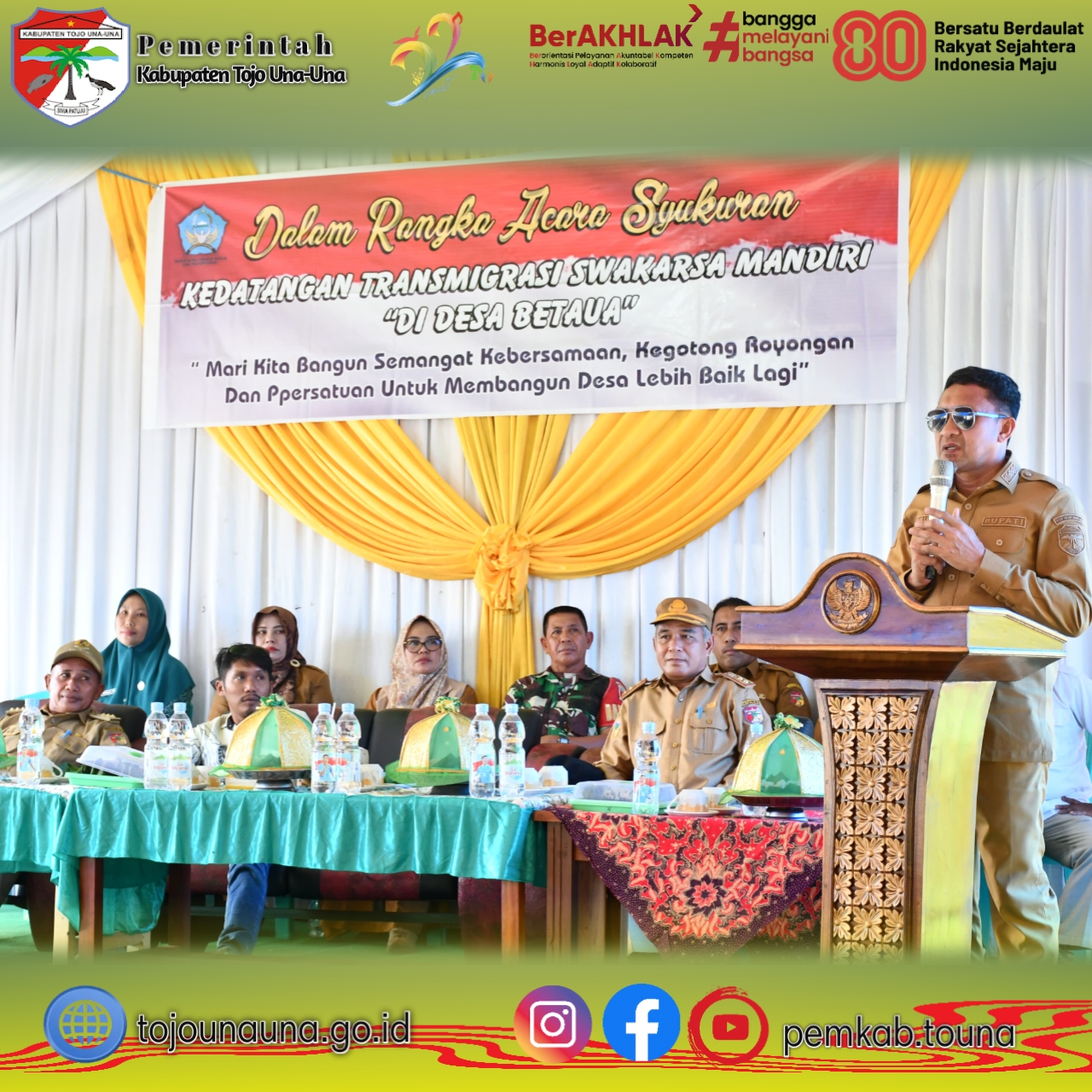 ๐ญ๐จ๐ฃ๐จ๐ฎ๐ง๐๐ฎ๐ง๐.๐ ๐จ.๐ข๐, ๐๐จ๐ฎ๐ง๐ - Bupati Tojo Una-Una, Ilham Lawidu, menghadiri acara syukuran 17 tahun kedatangan warga Transmigrasi Swakarsa Mandiri asal Kabupaten Trenggalek, Jawa Timur, yang digelar di Desa Betaua, Kecamatan Tojo, Kabupaten Tojo Una-Una, pada Senin siang (05/01/2026). Kegiatan tersebut dilaksanakan sebagai bentuk rasa syukur sekaligus momentum mempererat kebersamaan antara warga lokal dan warga transmigran dalam membangun kehidupan bermasyarakat yang harmonis.