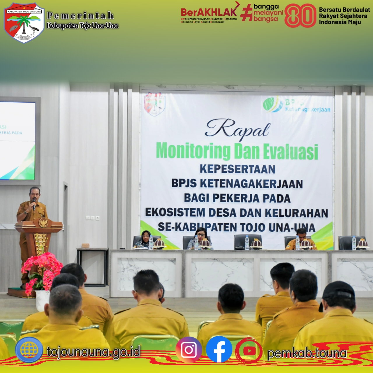๐ญ๐จ๐ฃ๐จ๐ฎ๐ง๐๐ฎ๐ง๐.๐ ๐จ.๐ข๐, ๐๐จ๐ฎ๐ง๐ - Bupati Tojo Una-Una melalui Sekretaris Daerah, Alfian Matajeng, secara resmi membuka Rapat Monitoring dan Evaluasi Kepesertaan BPJS Ketenagakerjaan bagi pekerja di ekosistem desa dan kelurahan se-Kabupaten Tojo Una-Una. Kegiatan tersebut berlangsung di Auditorium Kantor Bupati pada Selasa (09/12/2025).