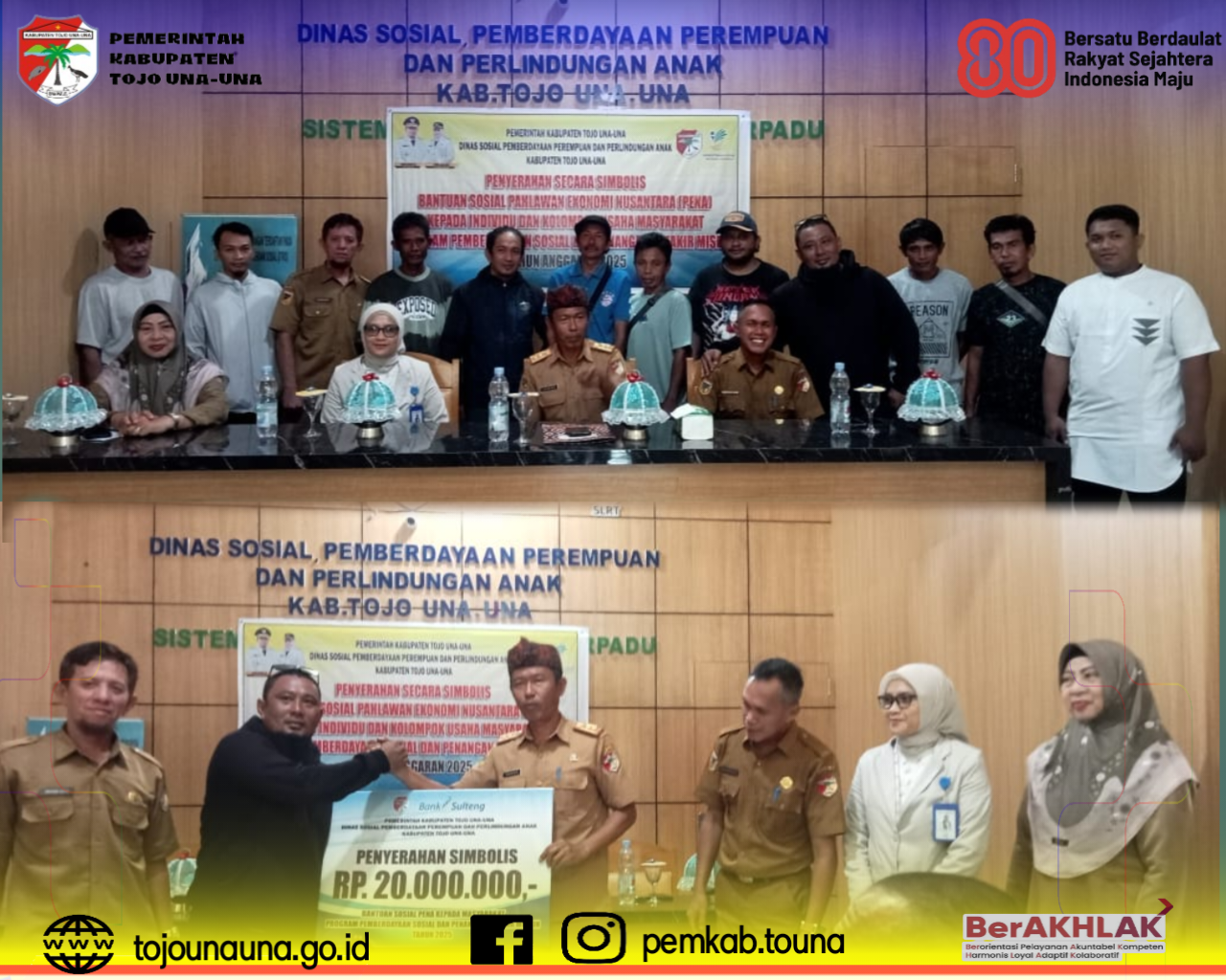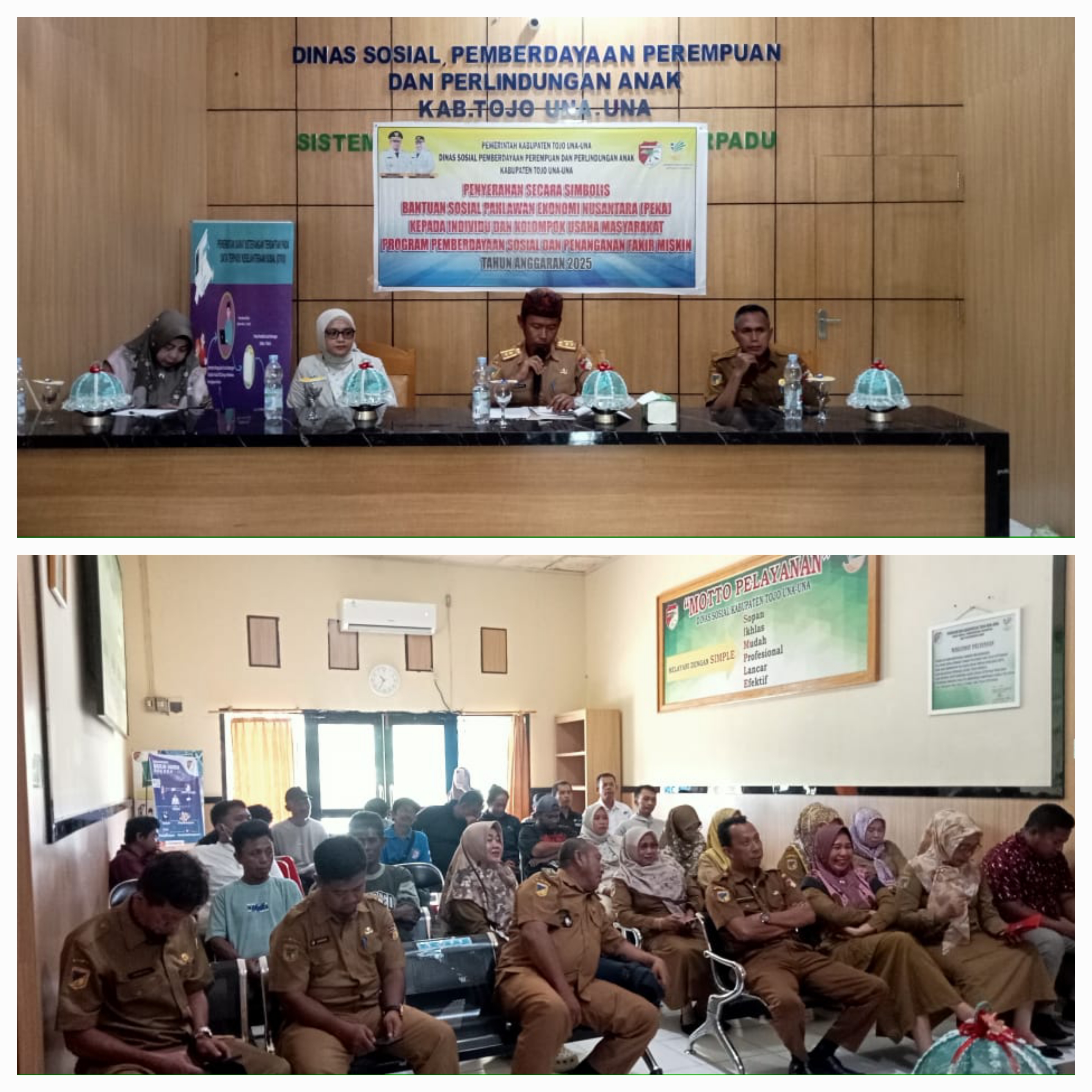 Bupati Tojo Una-Una dalam hal ini diwakili oleh Plt. Kepala Dinas Sosial, Pemberdayaan Perempuan dan Perlindungan Anak Kabupaten Tojo Una-Una, Ishak W. Kanali, menyerahkan secara simbolis bantuan sosial program Pahlawan Ekonomi Nusantara (PENA) yang berlangsung di ruangan SLRT Dinas Sosial, Senin (6/10/2025).