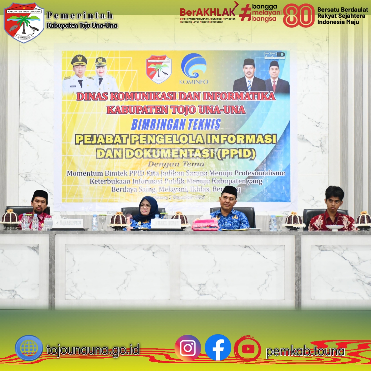๐ญ๐จ๐ฃ๐จ๐ฎ๐ง๐๐ฎ๐ง๐.๐ ๐จ.๐ข๐, ๐๐จ๐ฎ๐ง๐ - Pemerintah Kabupaten Tojo Una-Una melalui Dinas Komunikasi dan Informatika menggelar Bimbingan Teknis Pejabat Pengelola Informasi dan Dokumentasi (PPID) pada Senin (01/12/2025). Kegiatan yang dipusatkan di Auditorium Kantor Bupati ini resmi dibuka oleh Wakil Bupati Tojo Una-Una, Hj. Surya Lapasiri, dan diikuti oleh para Pejabat Administrator serta admin PPID dari seluruh perangkat daerah. Hadir pula pemateri/narasumber dari Komisi Informasi Provinsi Sulawesi Tengah.
