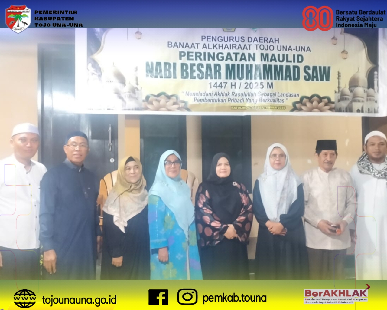 tojounauna.go.id, Touna - Wakil Bupati Kabupaten Tojo Una-Una, Hj. Surya Lapasiri menghadiri sekaligus menyampaikan sambutan pada peringatan Maulid Nabi Muhammad SAW yang di gelar di kelurahan Dondo Barat di kediaman ketua WIA Kabupaten Tojo Una-Una, Hj. Kalsum Al-Habsyi, Jumat 5 September 2025
