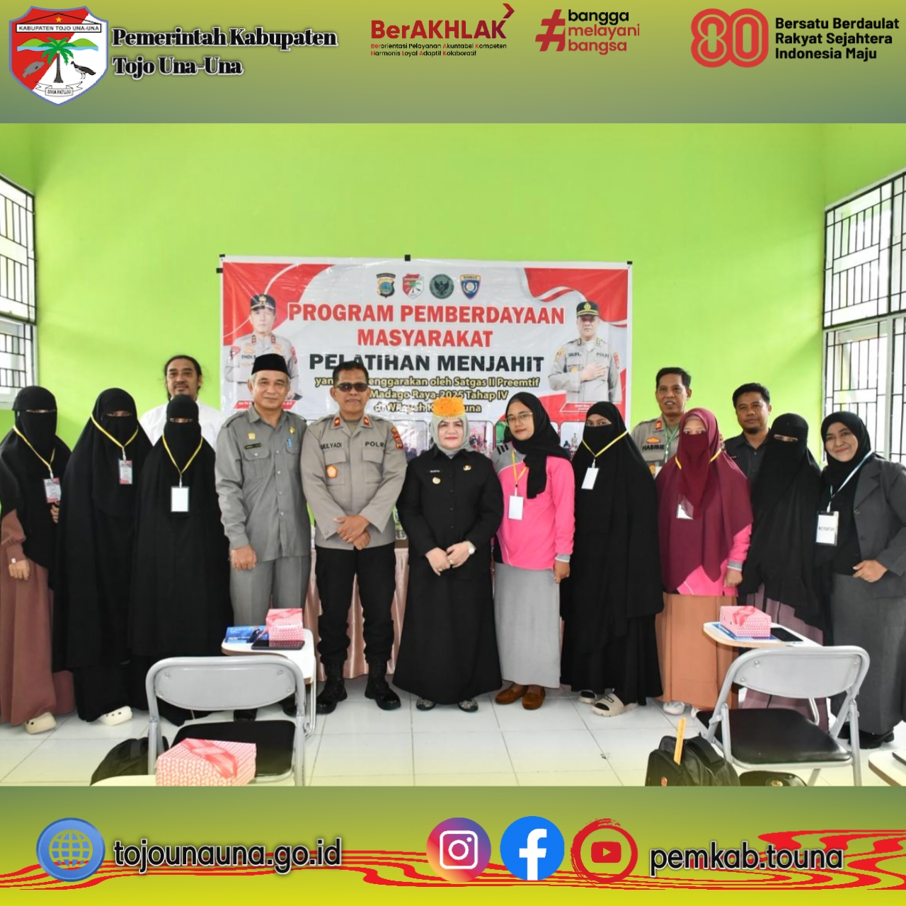 ๐ญ๐จ๐ฃ๐จ๐ฎ๐ง๐๐ฎ๐ง๐.๐ ๐จ.๐ข๐, ๐๐จ๐ฎ๐ง๐ โ Wakil Bupati Tojo Una-Una, Hj. Surya Lapasiri, menyampaikan apresiasi dan terima kasih setinggi-tingginya kepada Satgas Madago Raya Polres Tojo Una-Una atas inisiatif dan dedikasinya dalam menyelenggarakan Pelatihan Menjahit bagi Keluarga Eks Napiter, bertempat di Aula SKB (Sarana Kegiatan Belajar) Dondo, Kecamatan Ratolindo, pada Senin (10/11/2025).
