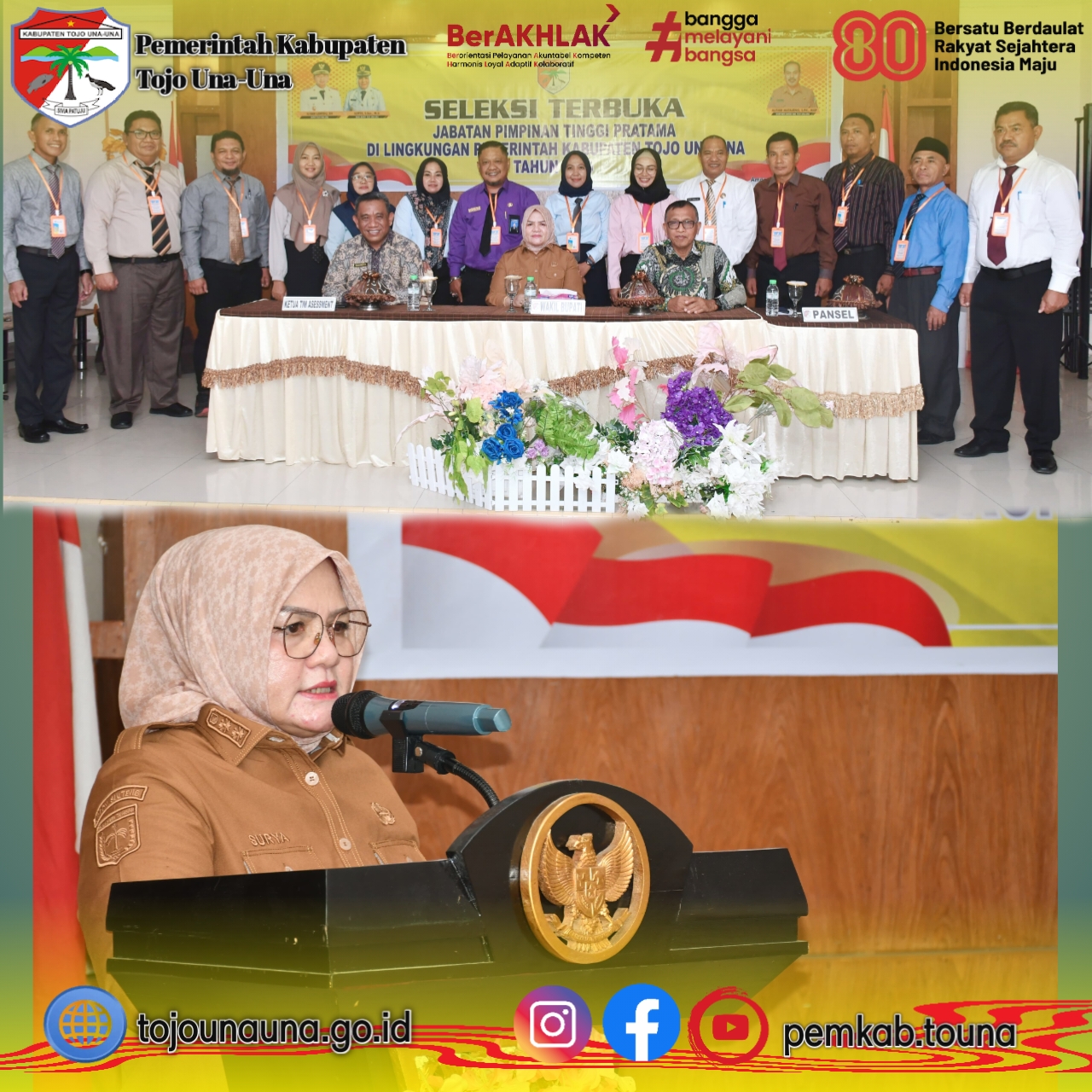 โSeleksi terbuka ini adalah bagian dari upaya kita bersama dalam meningkatkan kualitas layanan publik di Kabupaten Tojo Una-Una. Melalui kegiatan ini, kita ingin memastikan bahwa aparatur pemerintah bekerja secara optimal demi kesejahteraan masyarakat,โ tambahnya.